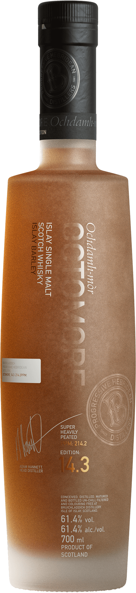 Octomore 14.3 témoigne de l'extraordinaire quête de saveur qui aboutit à combiner une tourbe très prégnante avec la variété et la variabilité des récoltes locales de son île natale.